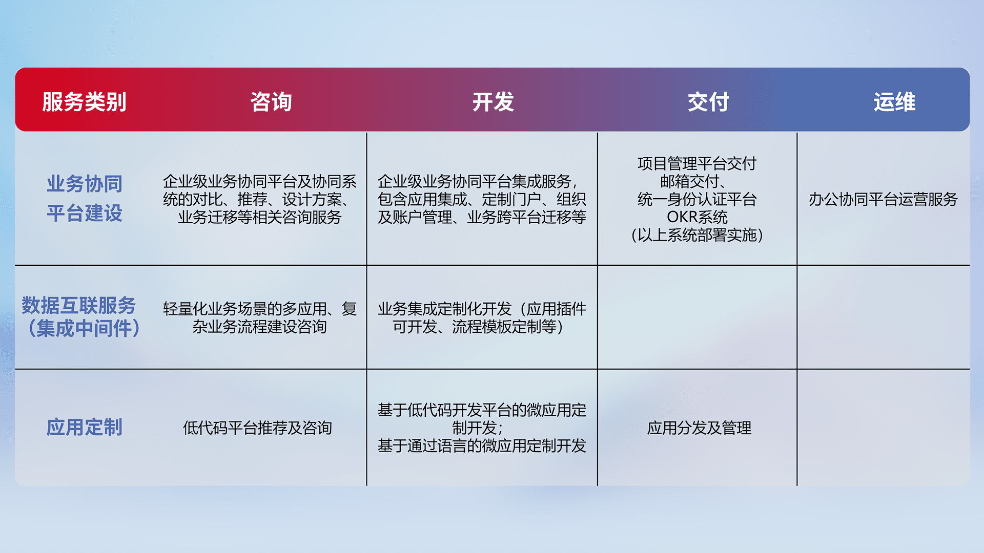 针对钉钉、、、、企微、、IDaas等平台级产品提供产品的规划、、、、方案、、交付、、、、定制化开发等服务,,实现如统一协同办公、、、、智能客户服务、、、、混合会议管理、、、智能数据查询、、、、等业务场景,,实现数字化转型。。